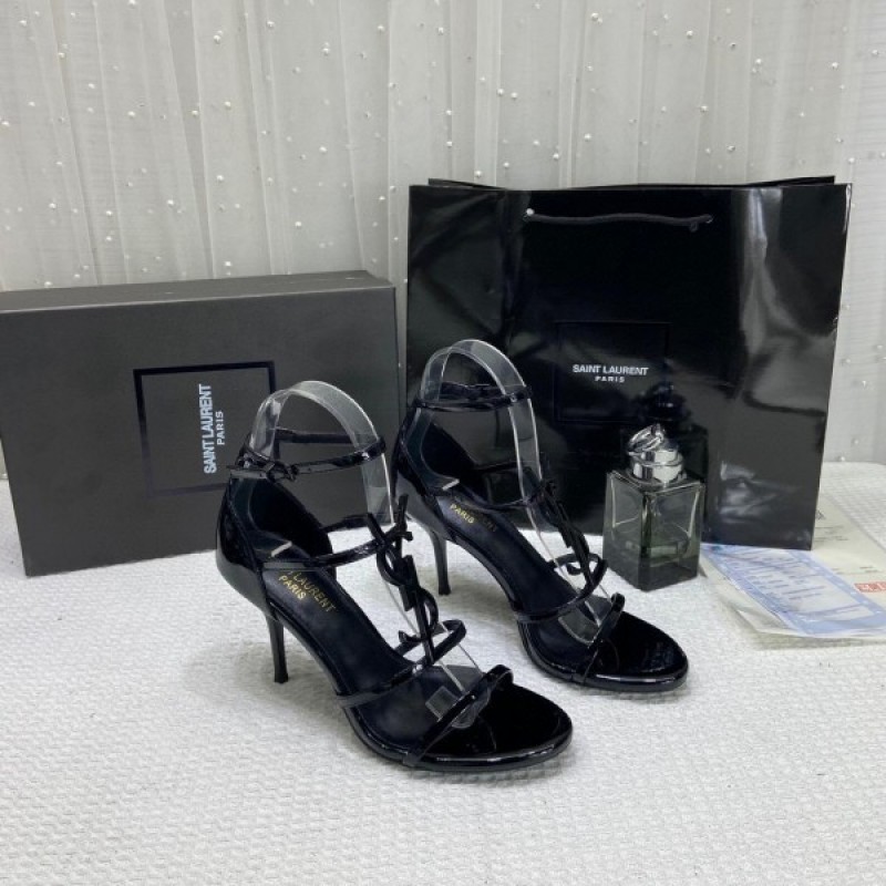 Ysl Saint Laurent Paris Black Patent Leather Monogram Cassandra Sandals Heel With OG Box Dust Bag Carry Bag B4U